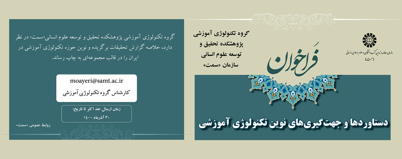 گروه تکنولوژی آموزشی پژوهشکده تحقیق و توسعه علوم انسانی«سمت» در نظر دارد، خلاصه گزارش تحقیقات برگزیده و نوین حوزه تکنولوژی آموزشی در ایران را در قالب مجموعهای به چاپ رساند.